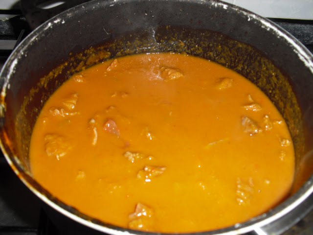 Quando a cebola estiver lourinha, junta-seum cadinho de água pouca, os pimentos e a cenoura, o cubo de carne e a polpa de tomate, e deixa-se refogar um pouco.