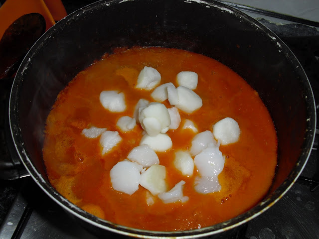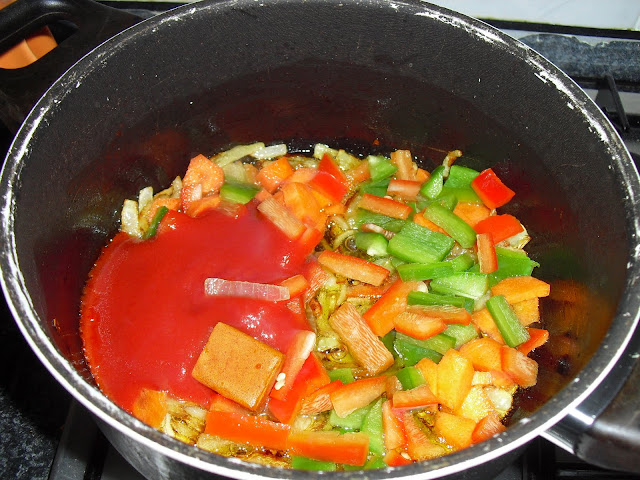 Adicionar os pimentos,cenoura cortados em pedaços pequenos,polpa de tomate e o cubo de marisco. Deixar refogar um pouquinho.