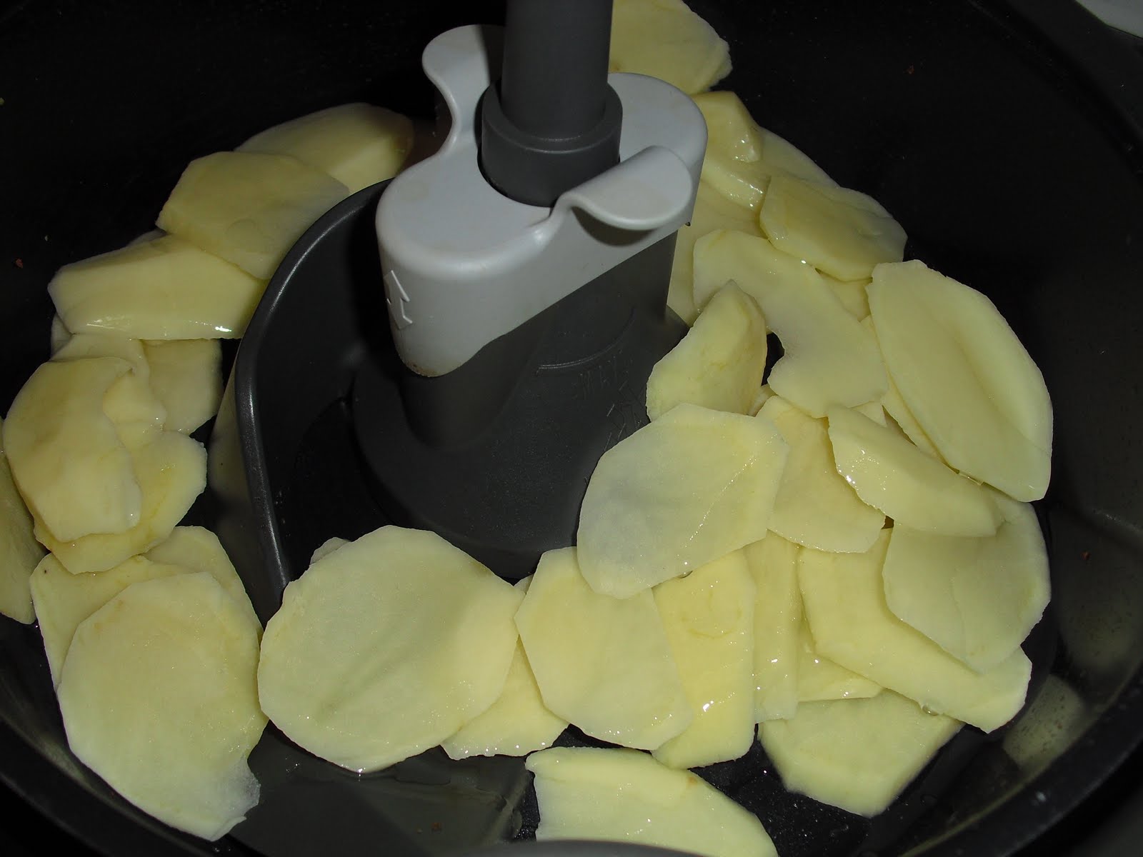 Descascar as batatas, partir em rodelas e colocar a fritar. Faço na actifry por isso coloco de inicio.