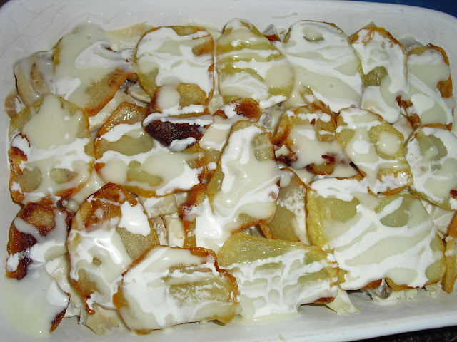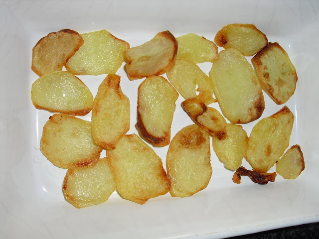 Colocar metade das batatas já fritas no fundo dum tabuleiro de ir ao forno.