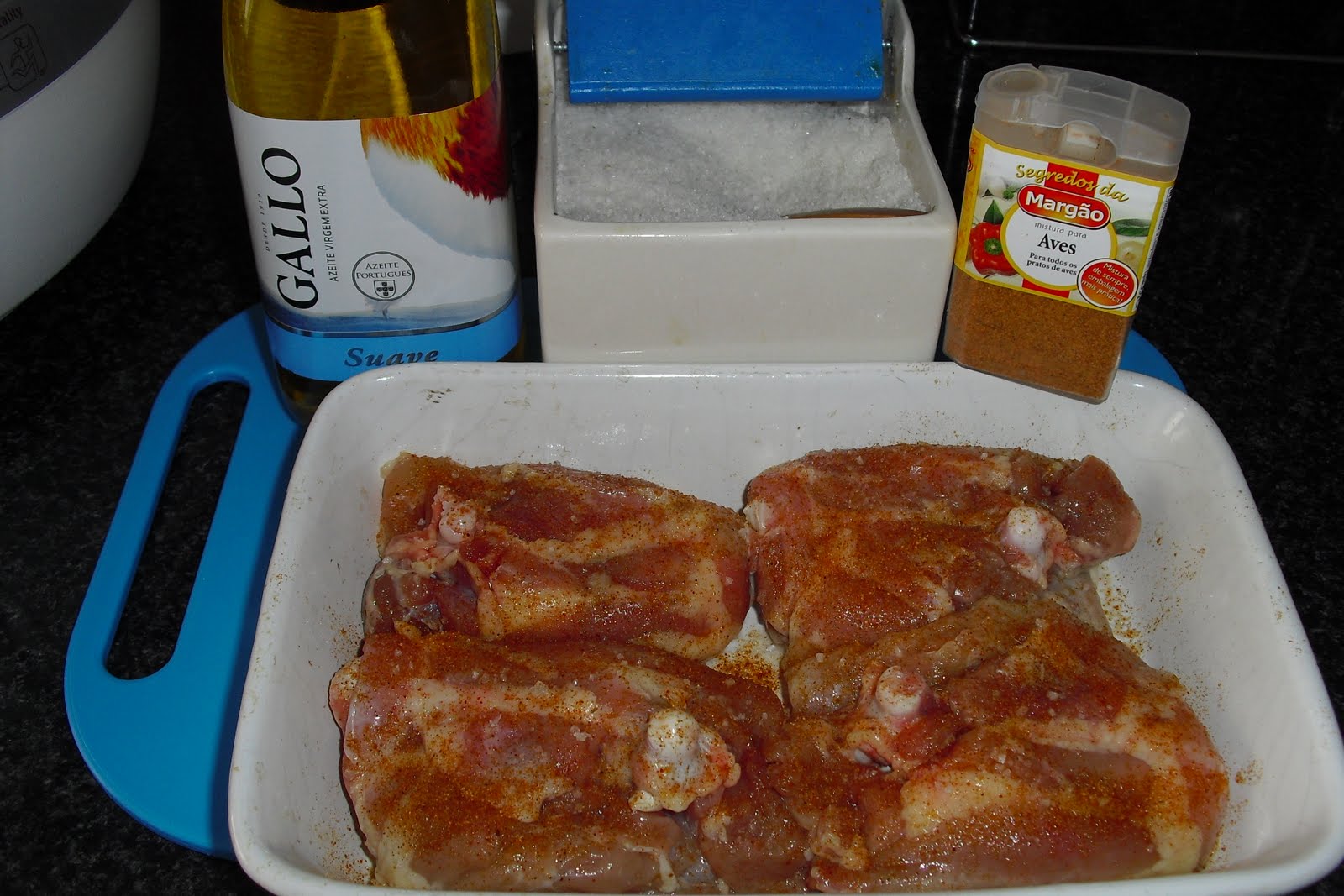 À marinada reservada, junta-se 2 colheres de sopa de pimentão doce e 2 colh sopa de azeite.