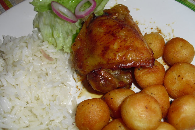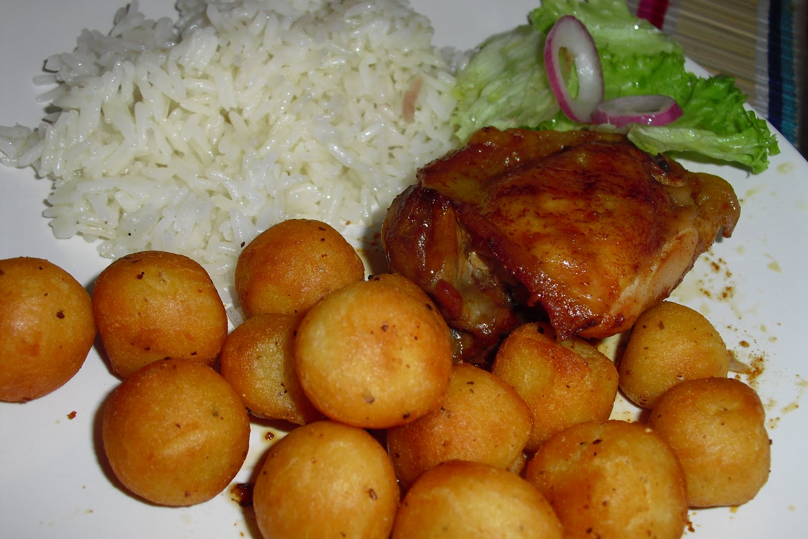Acompanhamos com salada, arroz thai jasmine e batatinhas noisettes .