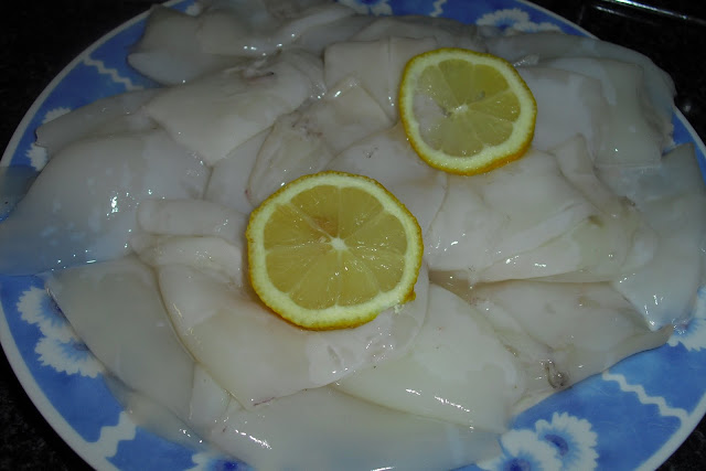 Deixar as lulas em sumo de limão durante umas horas. (deixei durante a noite para fazer ao almoço).