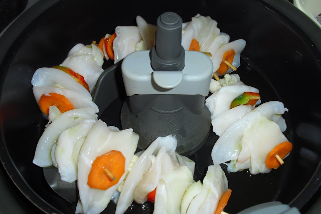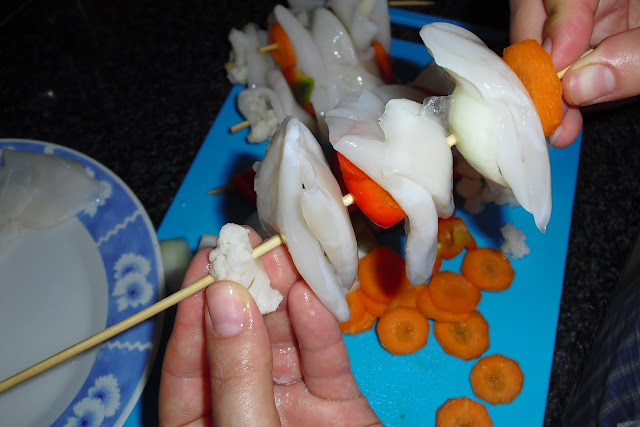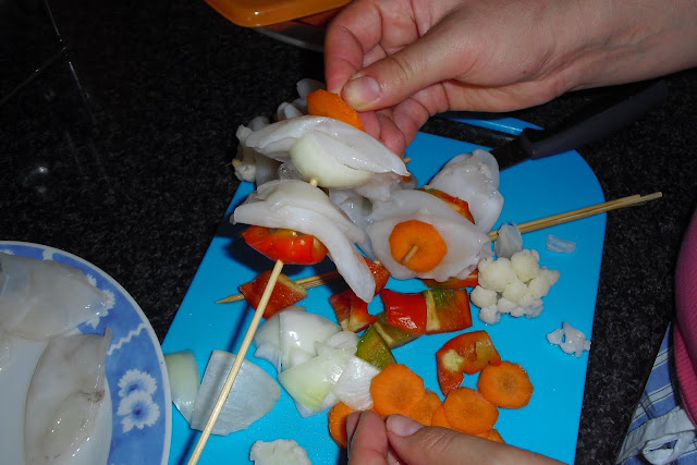 Ir espetando as lulas intercaladas do pimento, cenouras, cebola e pikles.