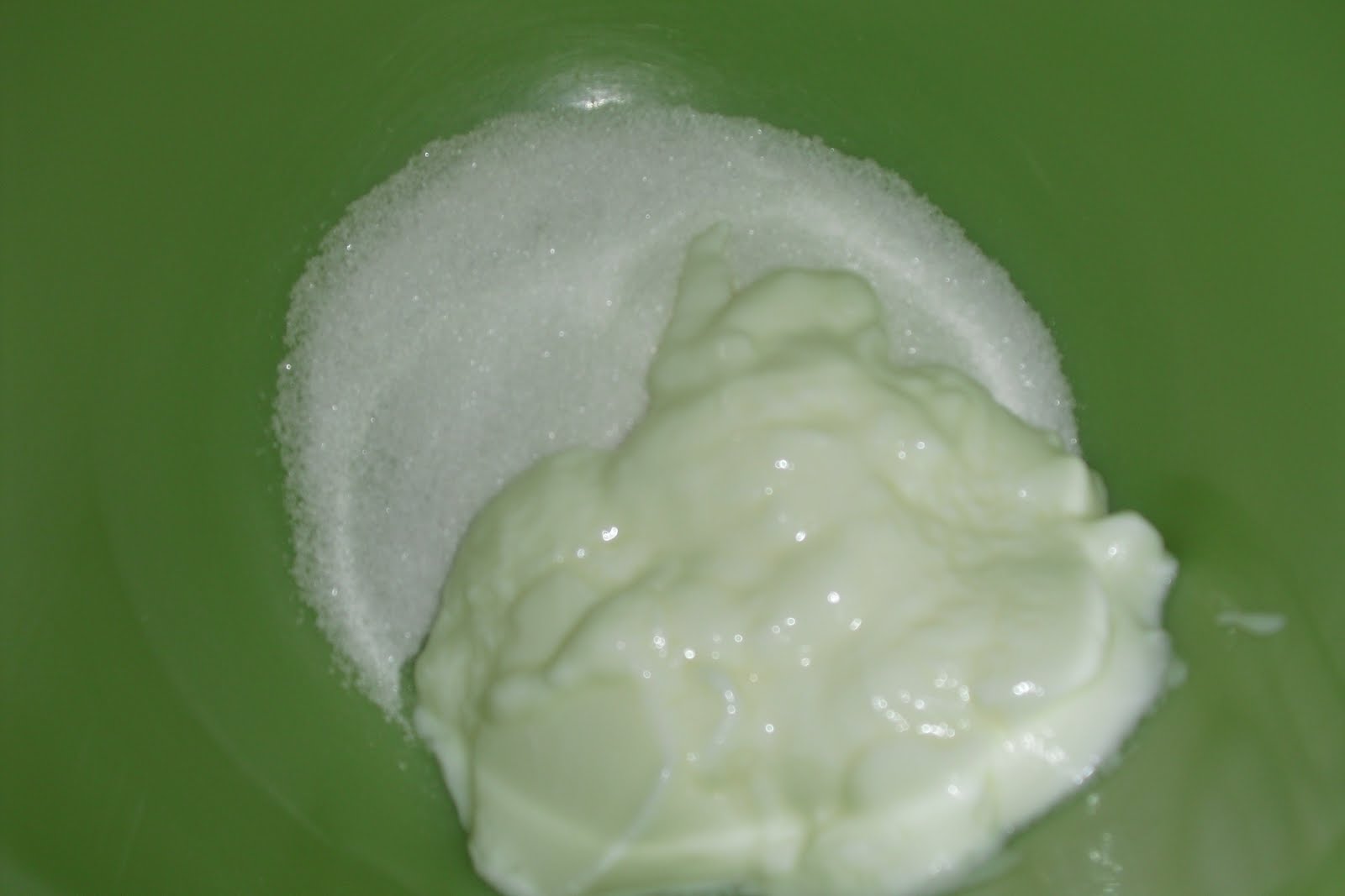 Misturar o iogurte o açucar e o leite e mexer bem para que fique tudo bem dissolvido.