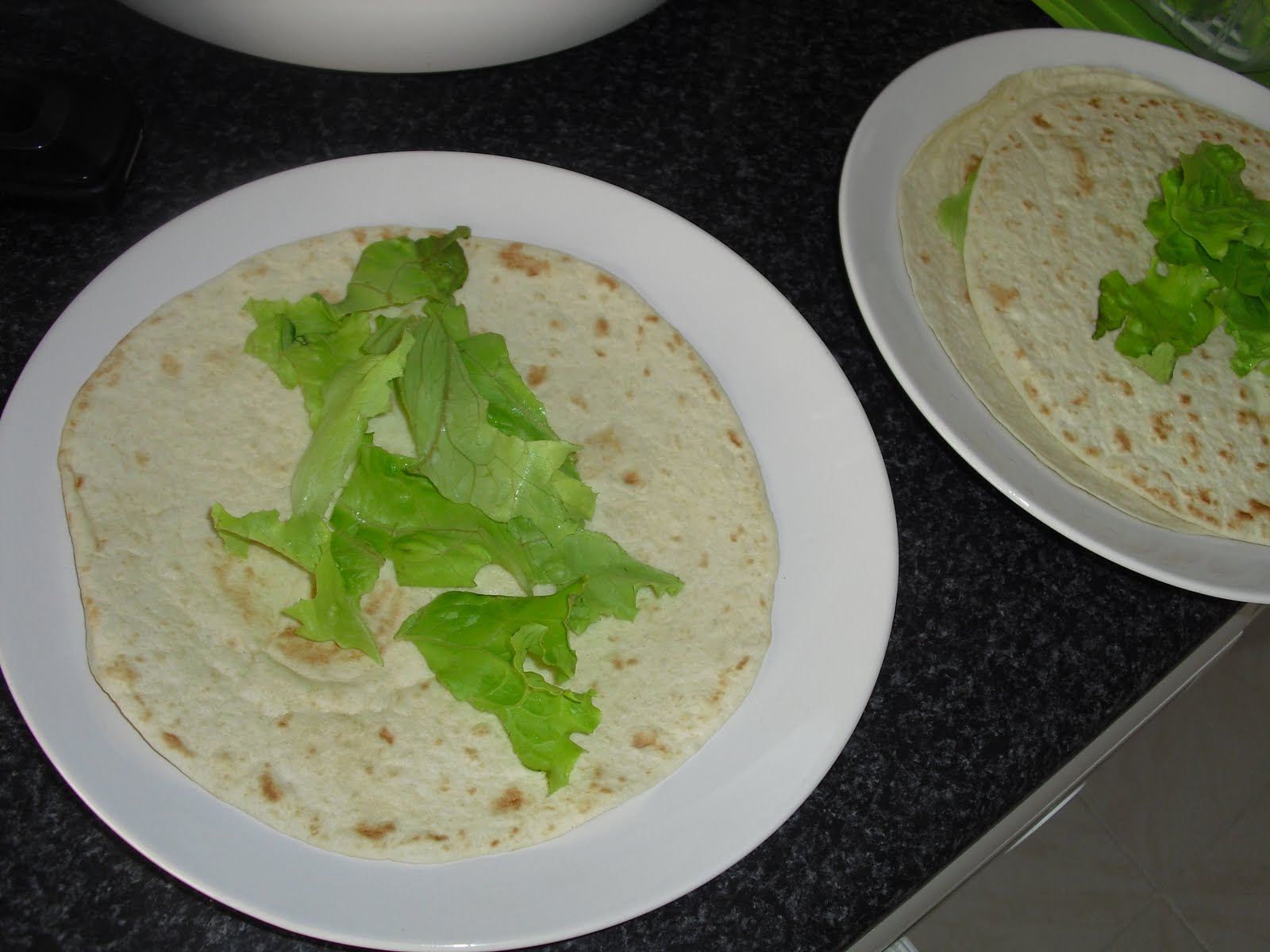 Coloca-se umas folhas de alface no centro das tortilhas.