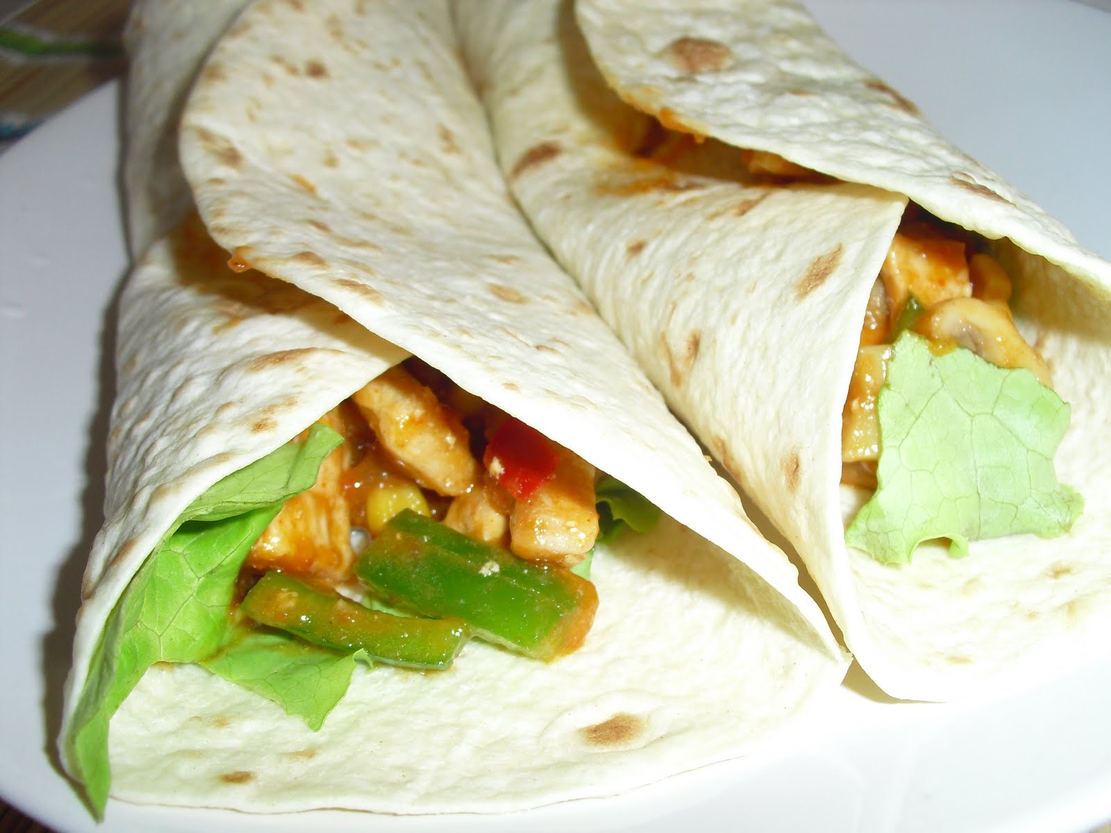 Dispõe-se um pouco da carne já pronta em cima da alface e enrola-se as tortilhas com as laterais para o interior como está nas fotos em baixo.