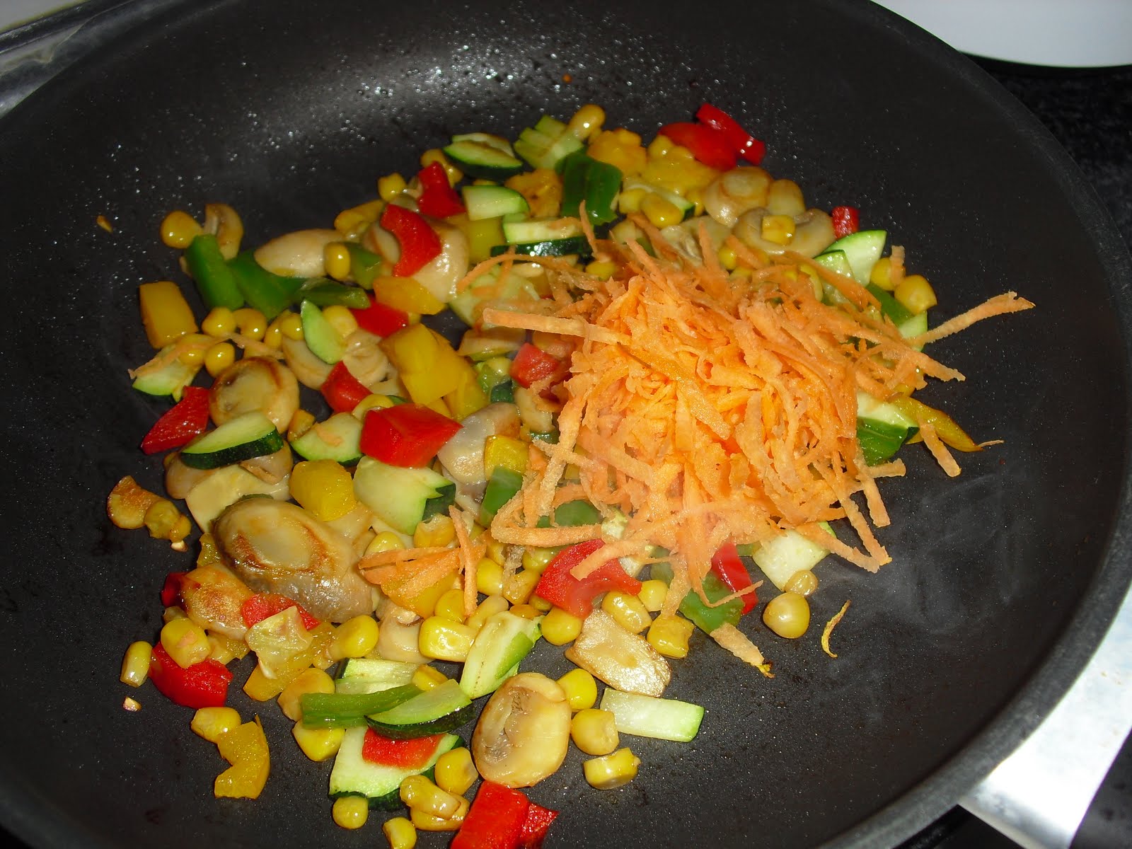 Num wok ou frigideira coloca-se um fio de azeite e junta-se os legumes todos excepto a cenoura.