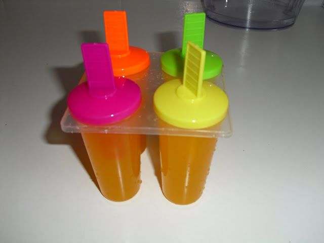 Colocar nas cuvetes dos gelados e levar ao congelador. ( Na cuvete verde, 2 deles tem uma colher a servir de "pauzinho" porque ainda tinha 2 gelados de limão, retirei-os embrulhei em pelicula aderente e guardei no congelador, e coloquei 2 colheres pequeninas a servir de "pau" de gelado!