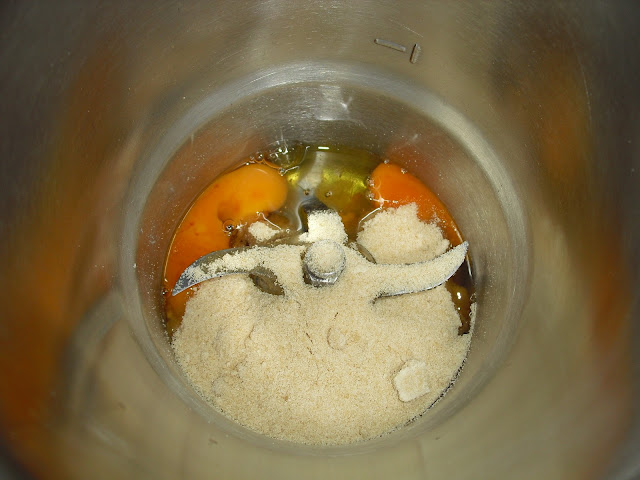 No copo da bimby (ou batedeira) juntam-se os ovos e o açucar e programa-se 4 min vel 4.