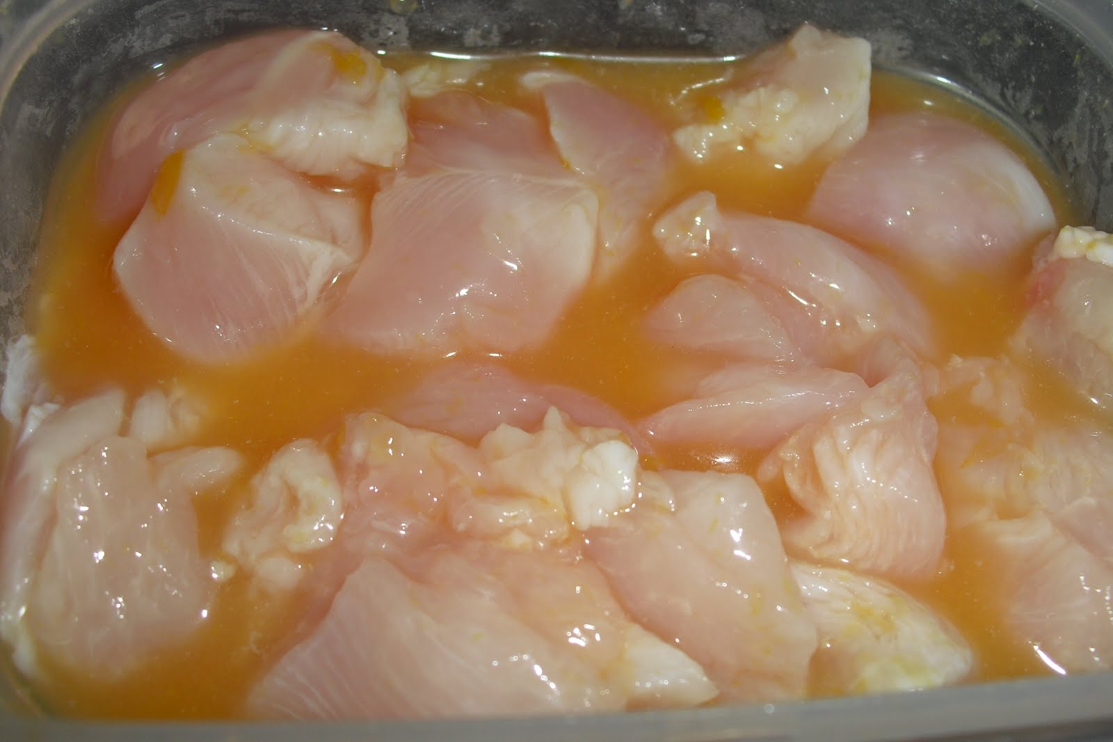 No dia anterior ou umas horas antes, colocar os pedacinhos de frango a marinar no sumo de laranja.