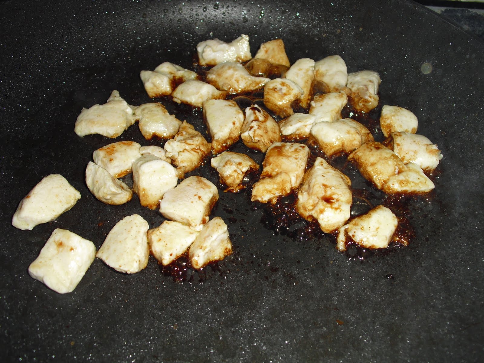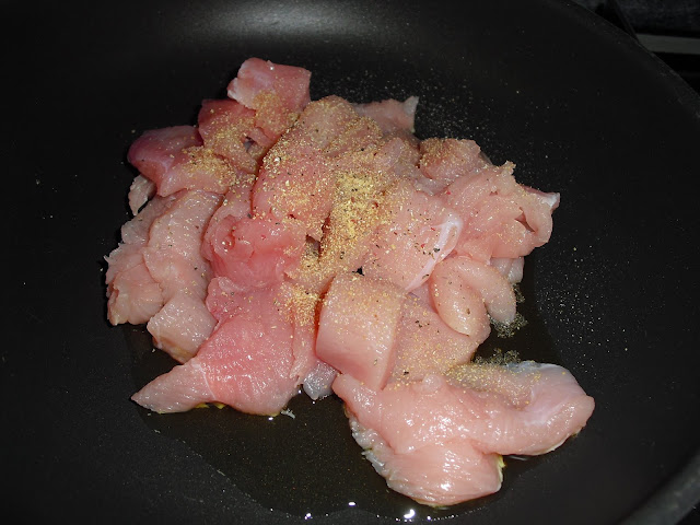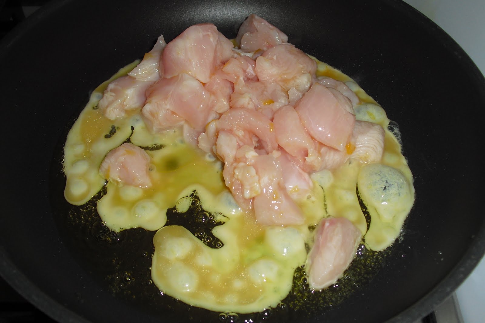 Colocar um fio de azeite numa frigideira ou wok. Qaundo estiver quente colocar os cubinhos de frango, e deixar saltear um pouquinho (1 ou 2 minutos).