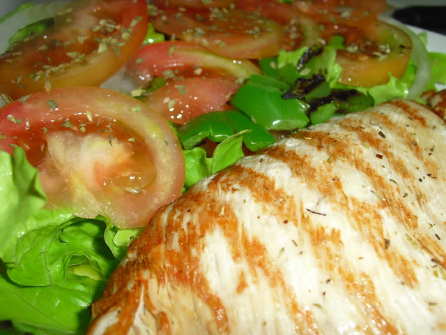 O meu bife acompanhei com salada de alface e tomate temperada com oregãos, tomilho e vinagre de modena.