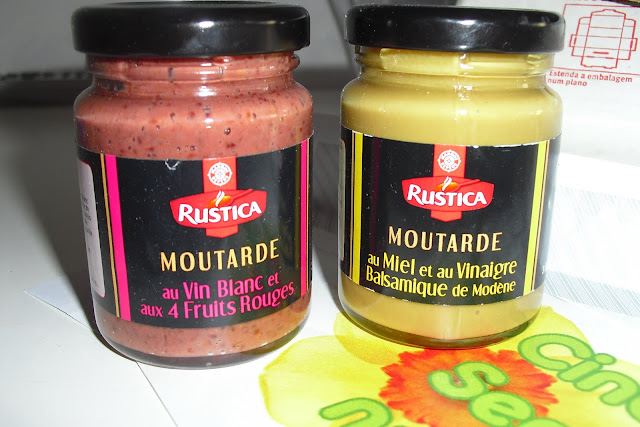 O meu marido é fã de mostarda, e como há uns tempos vi no blog cinco sentidos na cozinha umas mostardas que não conhecia. Falei com a Vánia e ela fez o favôr de me enviar 2 delas - com vinho branco e 4 frutos vermelhos, e com mel e vinagre balsamico de modena. Adoramos...