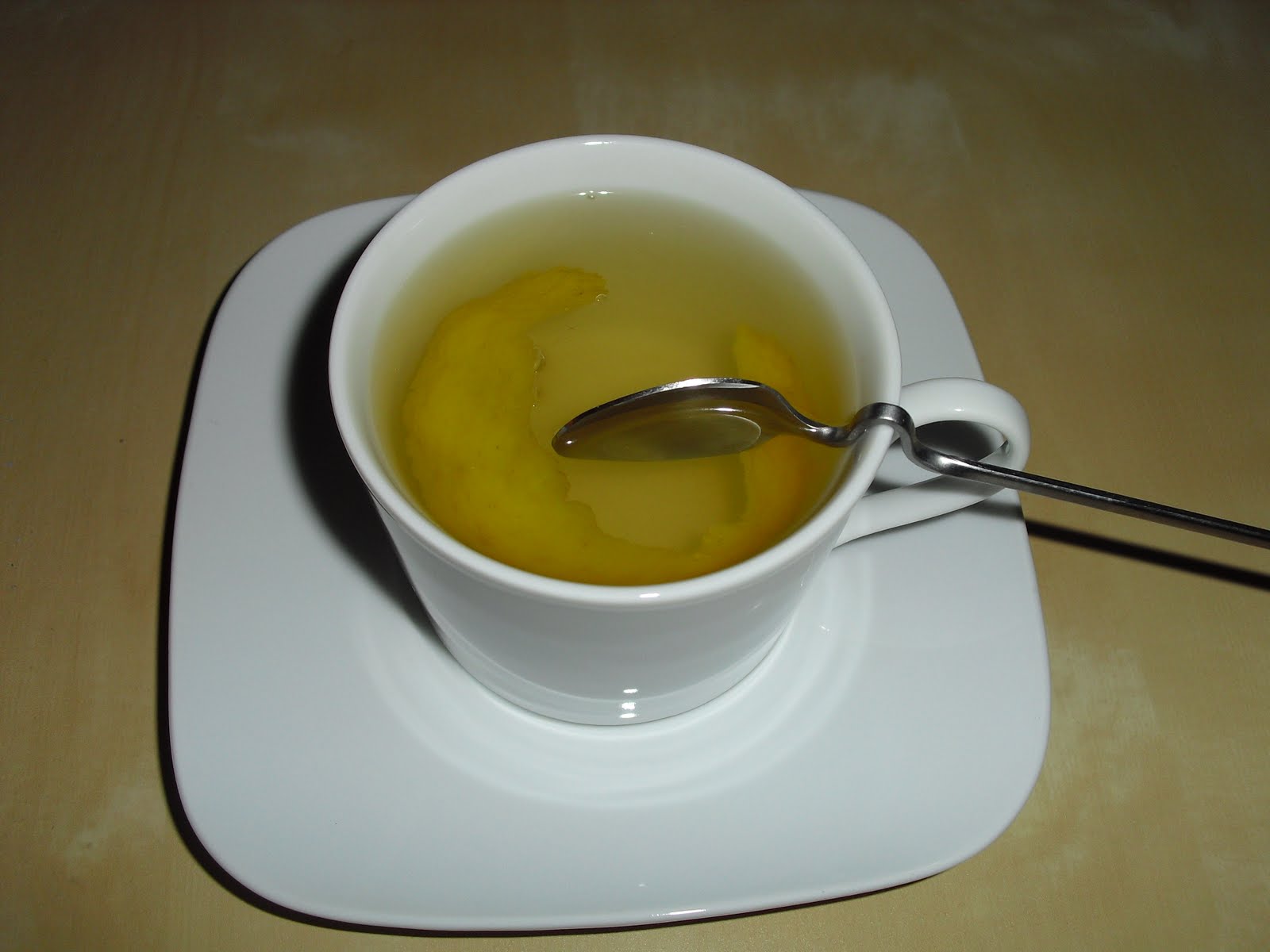 Colocar a água na chavena com uma casca de limão fininha (sem a parte branca), e adoçar com 2 colh de chá de mel!